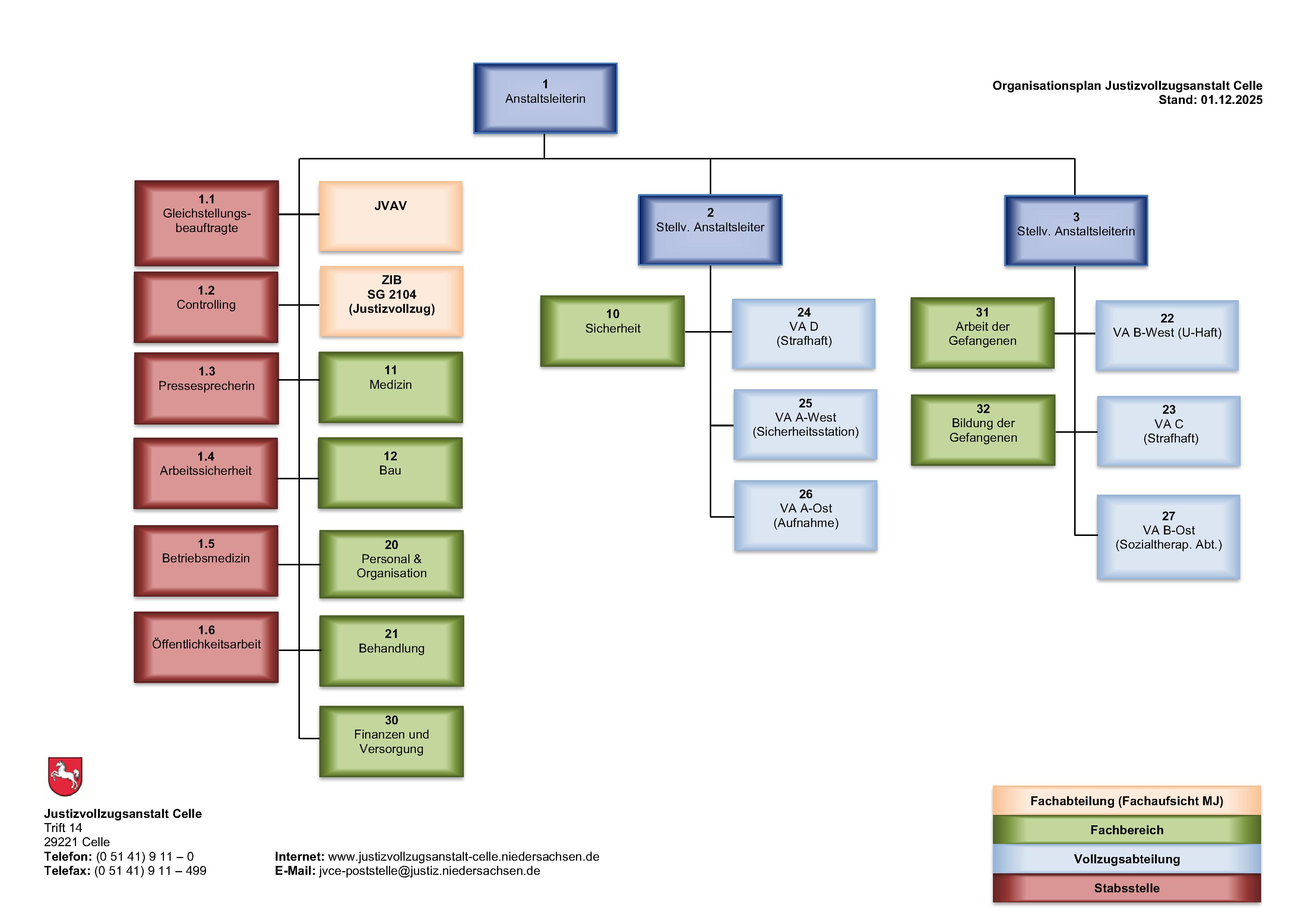 Die JVA Celle ist organisatorisch in Vollzugsabteilungen, Fachbereiche, Stabsstellen, Fachabteilungen und die Anstaltsleitung gegliedert.